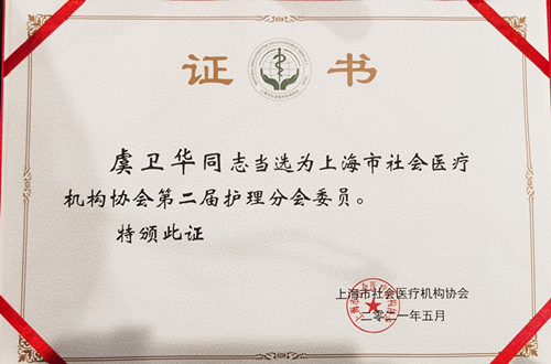 虞卫华同志当选为上海市社会医疗机构协会第二届护理分会委员(证书)