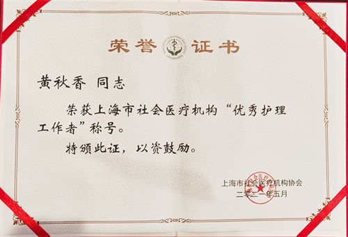 黄秋香同志荣获上海市社会医疗机构“优秀护理工作者”称号(证书)