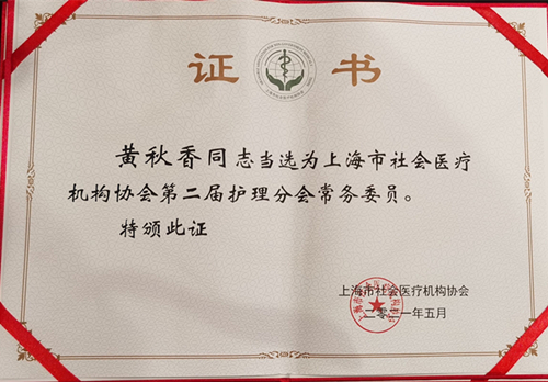 黄秋香同志当选为上海市社会医疗机构协会第二届护理分会常务委员(证书)