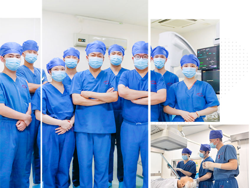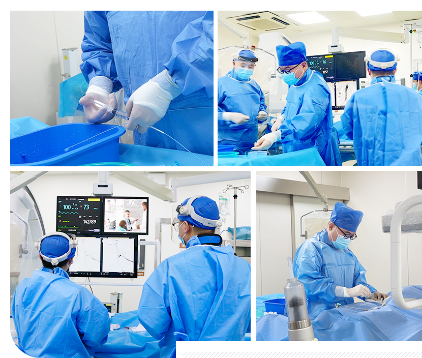 在皮肤上做直径几毫米的微小通道,在DSA影像设备导向下对病灶进行精准定位,将穿刺针微创穿刺股动脉进入血管系统,精准插入肿瘤病灶,导管注入超微粒药物和栓塞剂,阻断肿瘤细胞营养供应,使肿瘤细胞“饥饿”凋亡,失去活性。